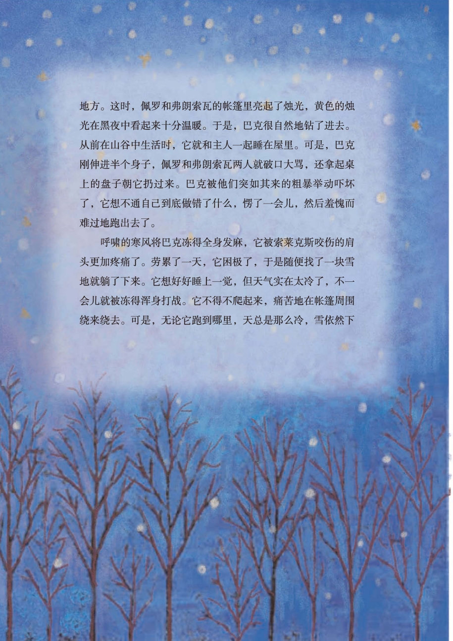 巴克突然想到,去看看其他同伴是如何睡觉的,也许它们找到了什么好办法呢。于是,巴克在帐篷四周跑来跑去,寻找同伴。但是,它在营地周围转了一圈又一圈,一个都没找到。