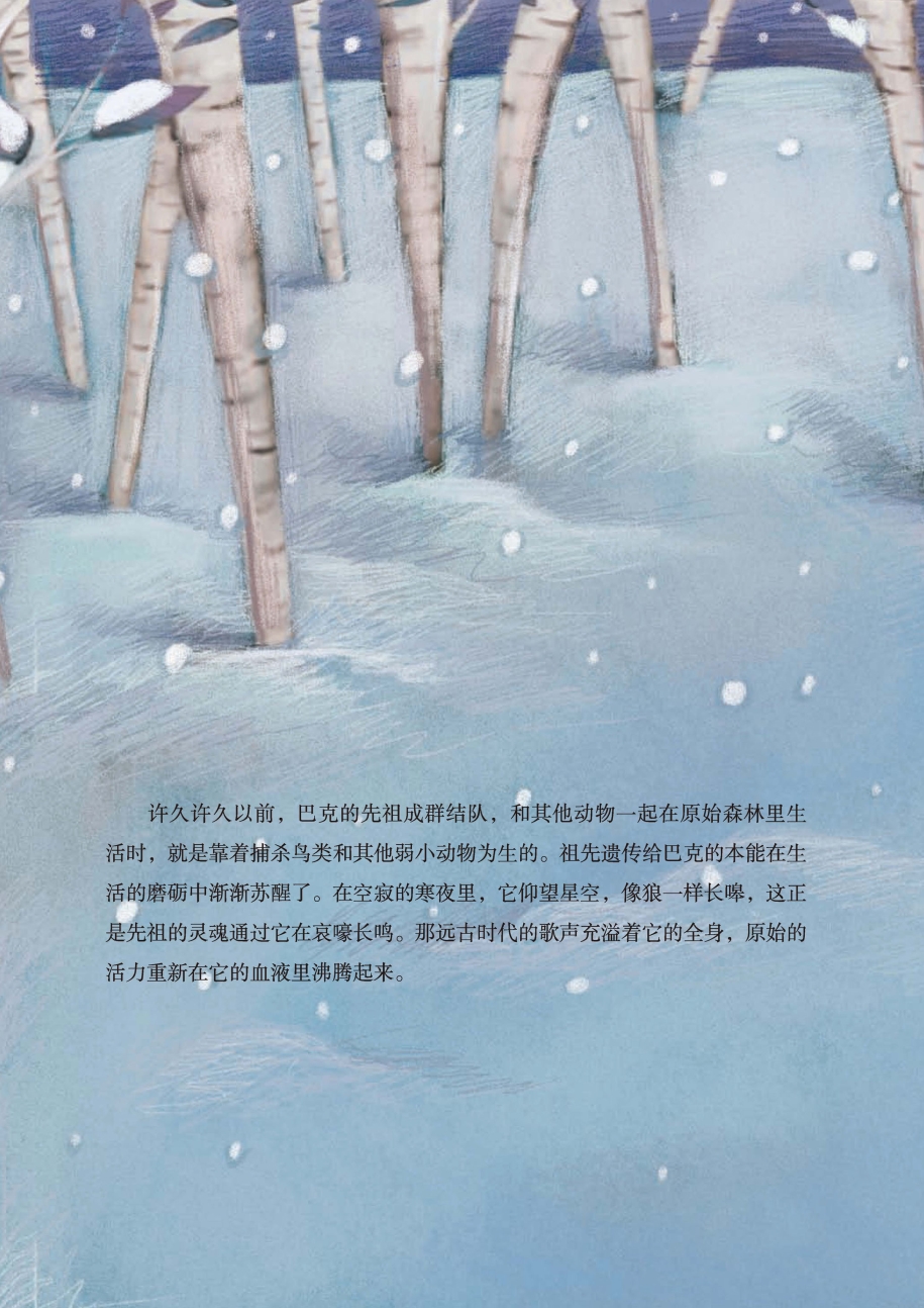 许久许久以前,巴克的先祖成群结队,和其他动物一起在原始森林里生活时,就是靠着捕杀鸟类和其他弱小动物为生的。祖先遗传给巴克的本能在生活的磨砺中渐渐苏醒了。在空寂的寒夜里,它仰望星空,像狼一样长嗥,这正是先祖的灵魂通过它在哀嚎长鸣。那远古时代的歌声充溢着它的全身,原始的活力重新在它的血液里沸腾起来。