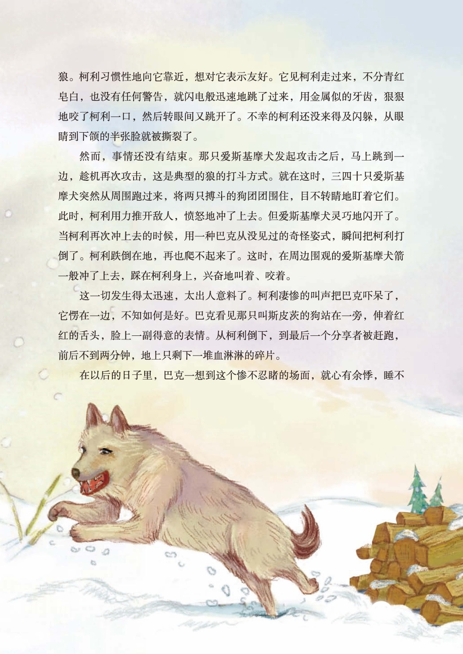 然而,事情还没有结束。那只爱斯基摩犬发起攻击之后,马上跳到一边,趁机再次攻击,这是典型的狼的打斗方式。就在这时,三四十只爱斯基摩犬突然从周围跑过来,将两只搏斗的狗团团围住,目不转睛地盯着它们。此时,柯利用力推开敌人,愤怒地冲了上去。但爱斯基摩犬灵巧地闪开了。当柯利再次冲上去的时候,用一种巴克从没见过的奇怪姿式,瞬间把柯利打倒了。柯利跌倒在地,再也爬不起来了。这时,在周边围观的爱斯基摩犬箭一般冲了上去,踩在柯利身上,兴奋地叫着、咬着。