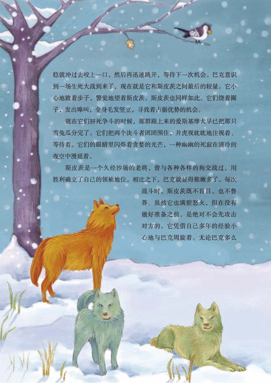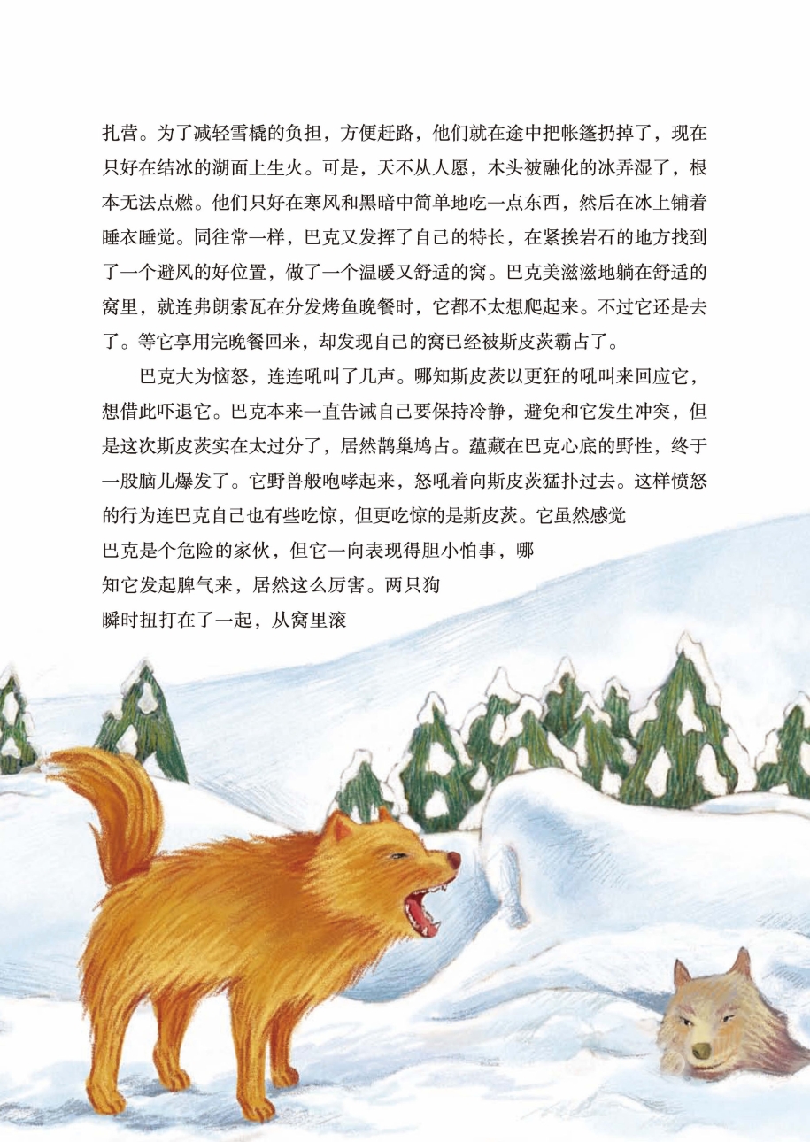弗朗索瓦闻声赶来,也被吓呆了。很快,他就搞清楚了它们打架的原因,但是为了狗队的团结,他朝巴克大声喊道:“巴克,让给它吧,让给斯皮茨!这个该死的家伙!你们两个别打了!”斯皮茨打心里喜欢那个窝,它正等着这样的话。而巴克,它辛辛苦苦才做好的窝,当然不会拱手让给别人,尤其是讨厌的斯皮茨。于是,它决定和斯皮茨奋战到底。