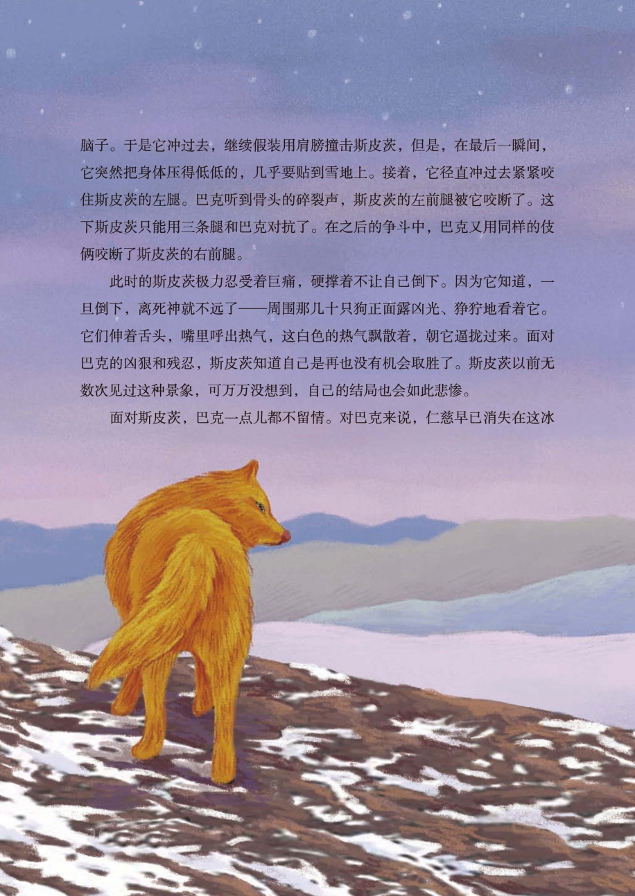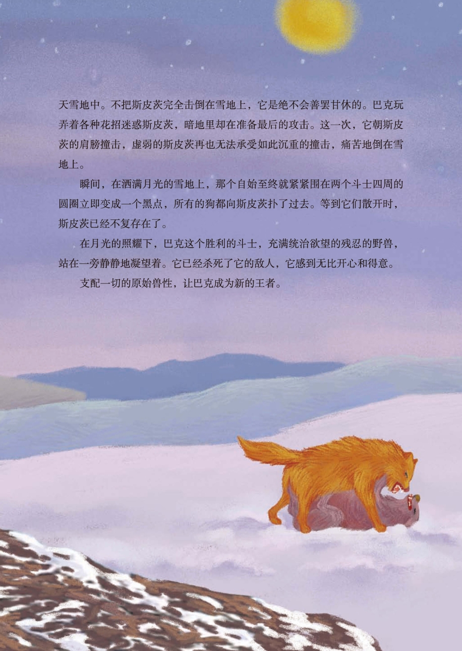面对斯皮茨,巴克一点儿都不留情。对巴克来说,仁慈早已消失在这冰天雪地中。不把斯皮茨完全击倒在雪地上,它是绝不会善罢甘休的。巴克玩弄着各种花招迷惑斯皮茨,暗地里却在准备最后的攻击。这一次,它朝斯皮茨的肩膀撞击,虚弱的斯皮茨再也无法承受如此沉重的撞击,痛苦地倒在雪地上。