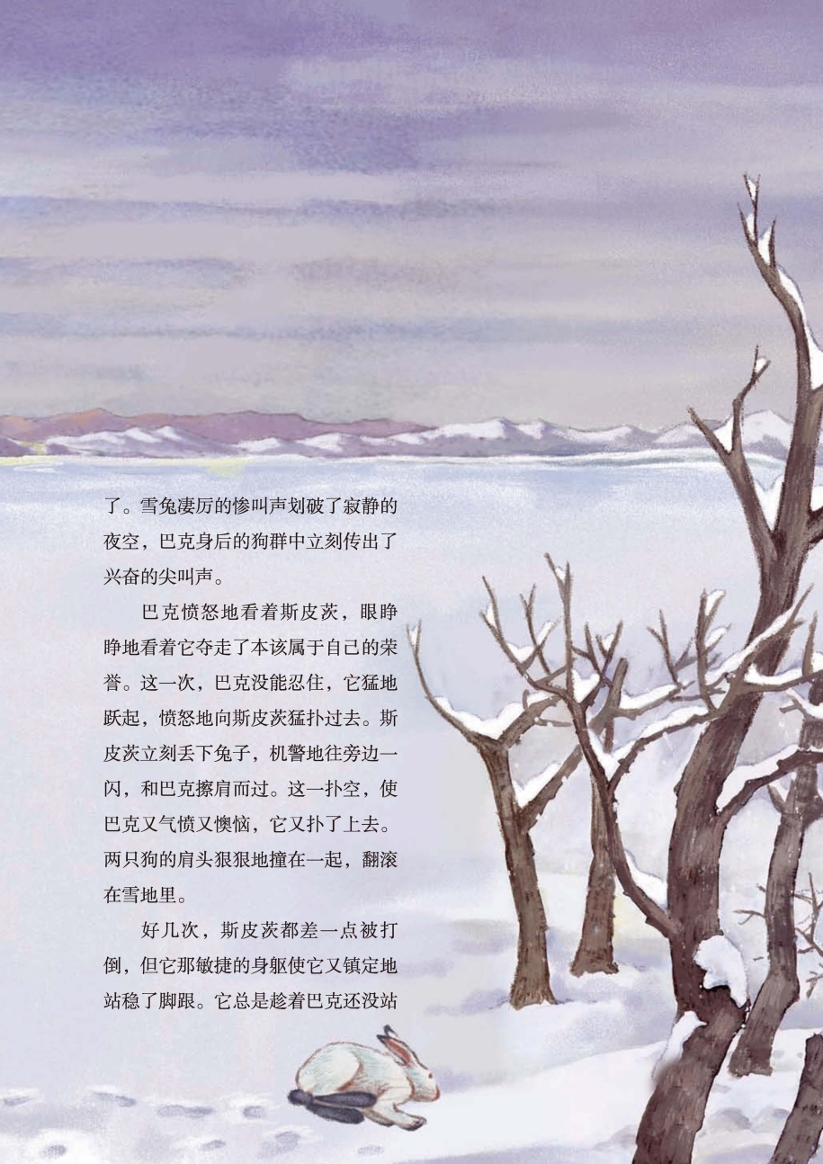 巴克愤怒地看着斯皮茨,眼睁睁地看着它夺走了本该属于自己的荣誉。这一次,巴克没能忍住,它猛地跃起,愤怒地向斯皮茨猛扑过去。斯皮茨立刻丢下兔子,机警地往旁边一闪,和巴克擦肩而过。这一扑空,使巴克又气愤又懊恼,它又扑了上去。两只狗的肩头狠狠地撞在一起,翻滚在雪地里。