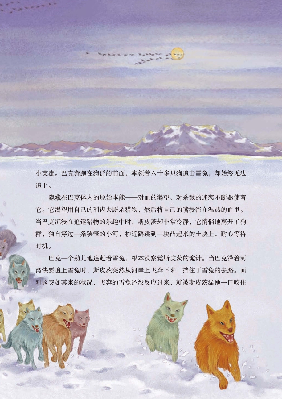 隐藏在巴克体内的原始本能——对血的渴望、对杀戮的迷恋不断驱使着它。它渴望用自己的利齿去厮杀猎物,然后将自己的嘴浸浴在温热的血里。当巴克沉浸在追逐猎物的乐趣中时,斯皮茨却非常冷静,它悄悄地离开了狗群,独自穿过一条狭窄的小河,抄近路跳到一块凸起来的土块上,耐心等待时机。