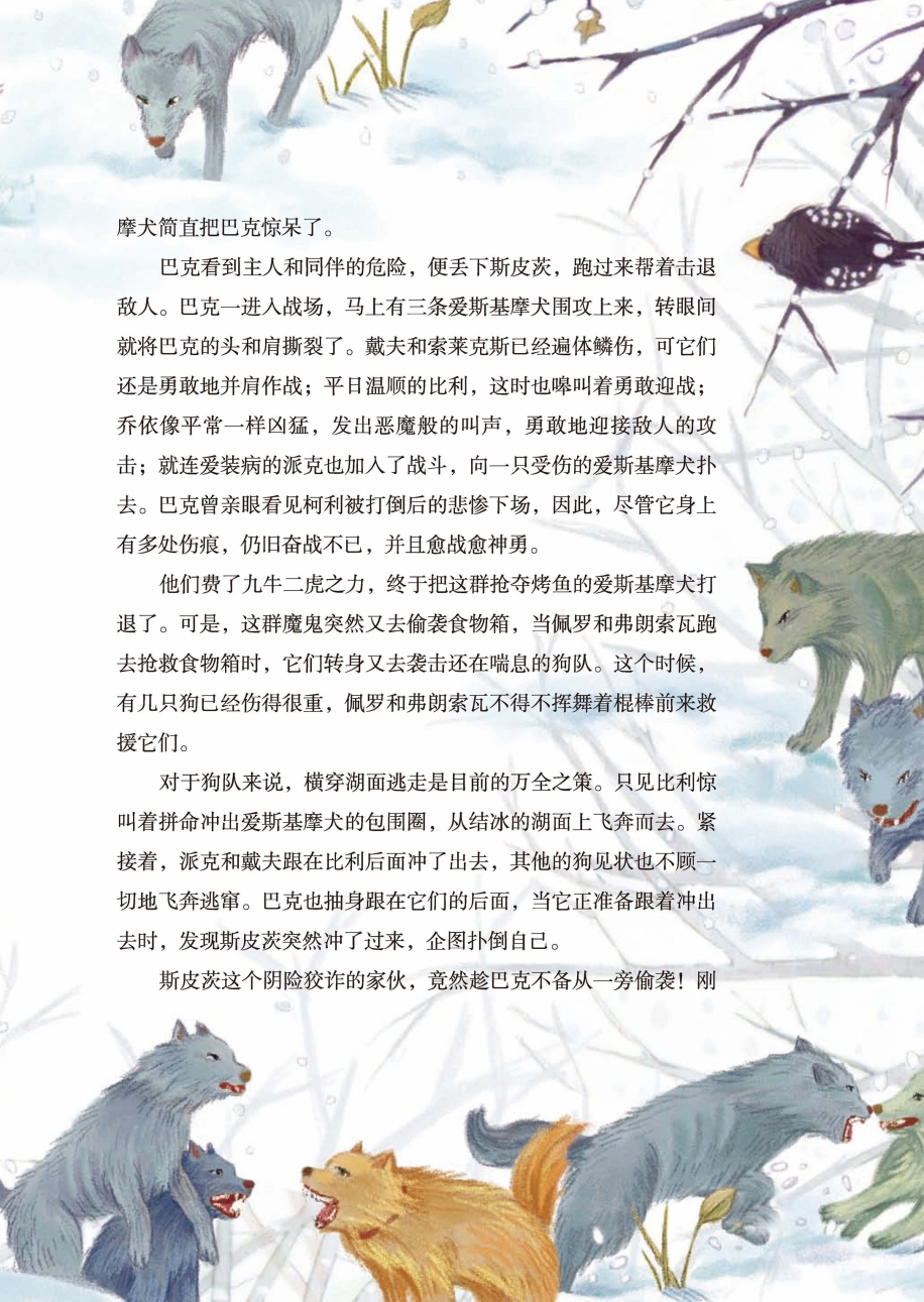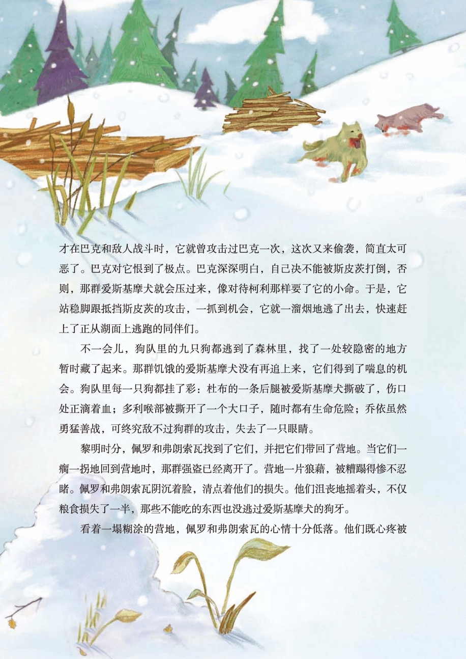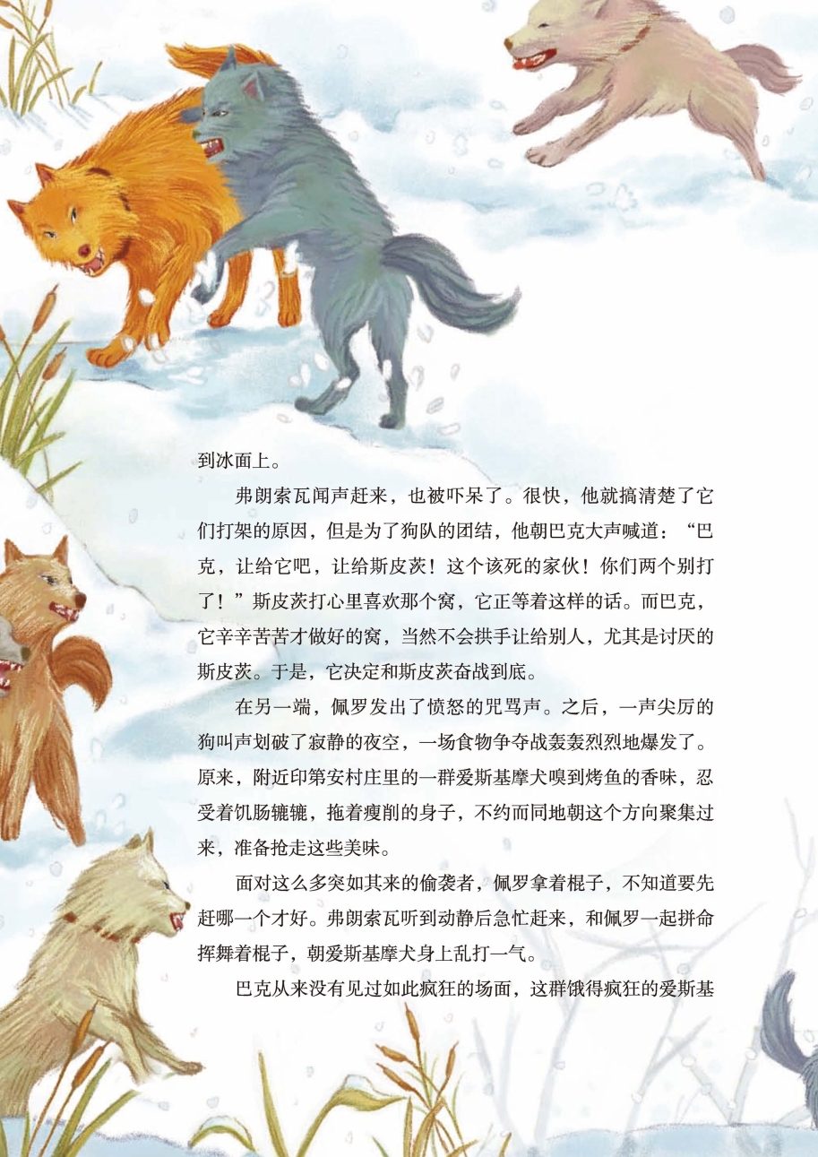 他们费了九牛二虎之力,终于把这群抢夺烤鱼的爱斯基摩犬打退了。可是,这群魔鬼突然又去偷袭食物箱,当佩罗和弗朗索瓦跑去抢救食物箱时,它们转身又去袭击还在喘息的狗队。这个时候,有几只狗已经伤得很重,佩罗和弗朗索瓦不得不挥舞着棍棒前来救援它们。