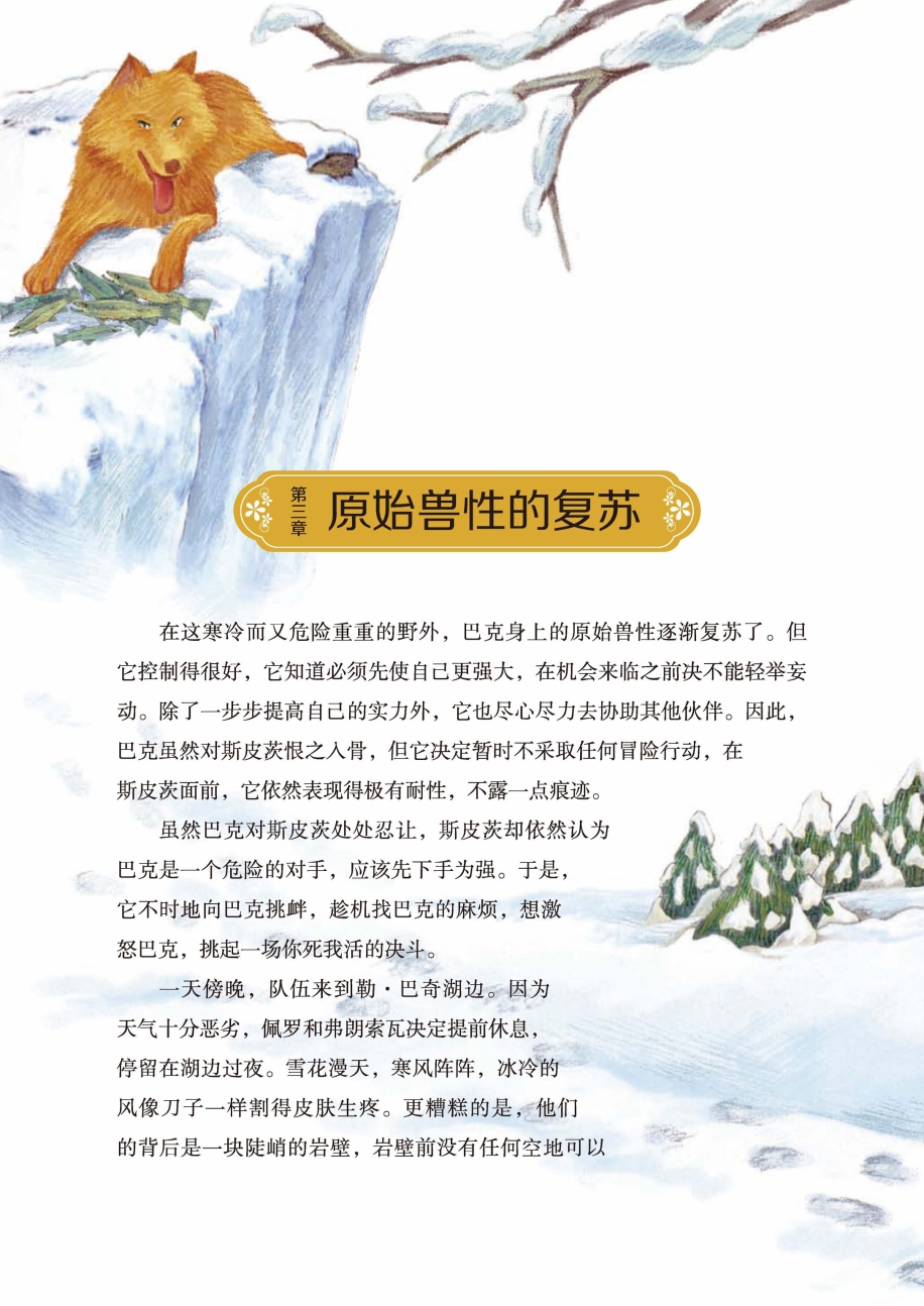 一天傍晚,队伍来到勒·巴奇湖边。因为天气十分恶劣,佩罗和弗朗索瓦决定提前休息,停留在湖边过夜。雪花漫天,寒风阵阵,冰冷的风像刀子一样割得皮肤生疼。更糟糕的是,他们的背后是一块陡峭的岩壁,岩壁前没有任何空地可以扎营。为了减轻雪橇的负担,方便赶路,他们就在途中把帐篷扔掉了,现在只好在结冰的湖面上生火。可是,天不从人愿,木头被融化的冰弄湿了,根本无法点燃。他们只好在寒风和黑暗中简单地吃一点东西,然后在冰上铺着睡衣睡觉。同往常一样,巴克又发挥了自己的特长,在紧挨岩石的地方找到了一个避风的好位置,做了一个温暖又舒适的窝。巴克美滋滋地躺在舒适的窝里,就连弗朗索瓦在分发烤鱼晚餐时,它都不太想爬起来。不过它还是去了。等它享用完晚餐回来,却发现自己的窝已经被斯皮茨霸占了。