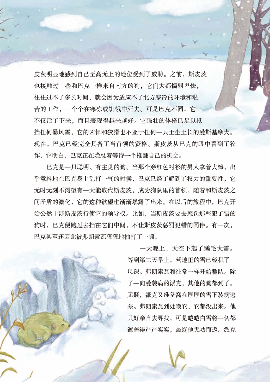 一天晚上,天空下起了鹅毛大雪。等到第二天早上,营地里的雪已经积了一尺深。弗朗索瓦和往常一样开始整队。除了一向爱装病的派克,其他的狗都到了。无疑,派克又准备窝在厚厚的雪下装病逃差。弗朗索瓦到处唤它,它都没出来。他只好亲自去寻找,可是皑皑白雪将一切都遮盖得严严实实,最终他无功而返。派克的怠工激怒了斯皮茨,它怒气冲冲地在营地附近到处找,每一个可疑的地方它都嗅一嗅,挖开来看个清楚。