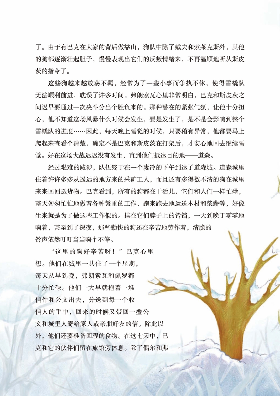 “这里的狗好辛苦呀!”巴克心里想。他们在城里一共住了一个星期,每天从早到晚,弗朗索瓦和佩罗都十分忙碌。他们一大早就抱着一堆信件和公文出去,分送到每一个收信人的手中,回来的时候又带回一叠公文和城里人寄给家人或亲朋好友的信。除此以外,他们还要准备回程的食物。在这七天中,巴克和它的伙伴们留在旅馆旁休息。除了偶尔和弗朗索瓦出去散散步之外,大部分时间都待在那里。经过长途跋涉和辛苦工作之后,拖橇狗非常需要充分休息,以便恢复体力。