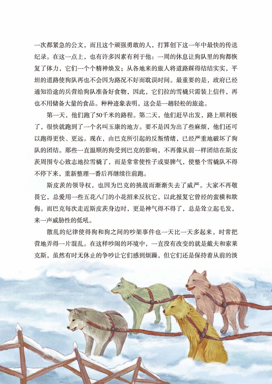 第一天,他们跑了50千米的路程。第二天,他们赶早出发,路上顺利极了,很快就跑到了一个名叫玉康的地方。要不是因为出了些麻烦,他们还可以跑得更快、更远。现在,由巴克所引起的反叛情绪,已经严重地破坏了狗队的团结。那些一直温顺的狗受到巴克的影响,不再像从前一样团结在斯皮茨周围专心致志地拉雪橇了,而是常常使性子或耍脾气,使整个雪橇队不得不停下来,重新整理一番后再继续往前跑。