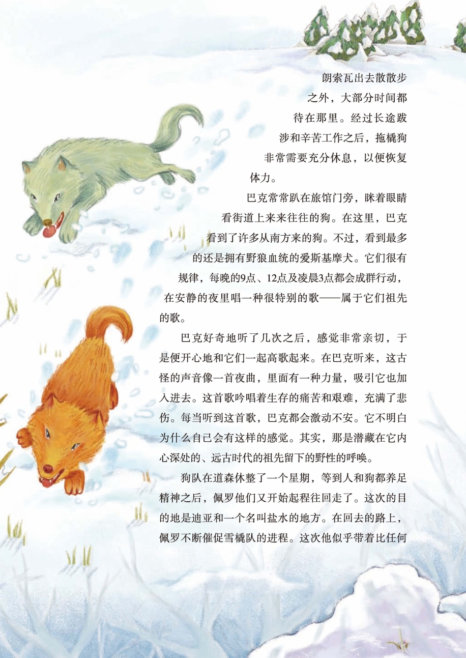 巴克好奇地听了几次之后,感觉非常亲切,于是便开心地和它们一起高歌起来。在巴克听来,这古怪的声音像一首夜曲,里面有一种力量,吸引它也加入进去。这首歌吟唱着生存的痛苦和艰难,充满了悲伤。每当听到这首歌,巴克都会激动不安。它不明白为什么自己会有这样的感觉。其实,那是潜藏在它内心深处的、远古时代的祖先留下的野性的呼唤。