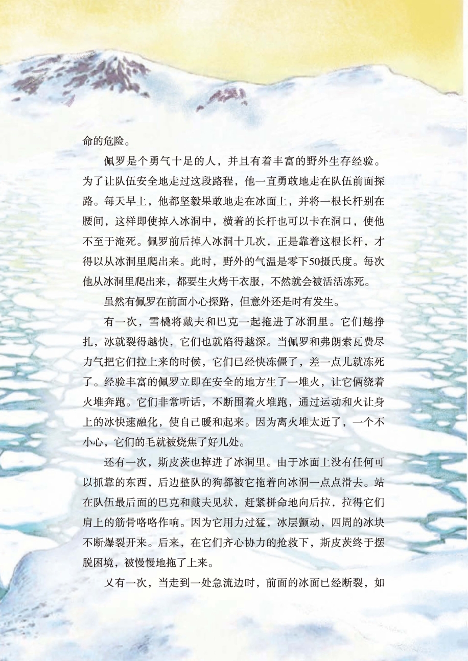 又有一次,当走到一处急流边时,前面的冰面已经断裂,如果再不逃出这一片冰区,整个队伍将掉入河里全军覆没。唯一的退路是立在旁边的一面崖壁,只有爬上悬崖绕过去,才能避免掉入河里。这时,佩罗急中生智,想出了一个绝妙的办法。他先把所有的皮带以及雪橇和套具上的皮条、皮绳结成一根长长的绳子,然后率先爬上悬崖,在弗朗索瓦的协助下将狗和货物依次拉上去,最后弗朗索瓦才爬了上去。接下来,他们又开始在崖壁上寻找下去的路,而下悬崖的根本方法还是利用这根绳子。当他们再度回到河面上的时候,天已经全黑了。这一天他们仅仅走了四百米左右的路程。