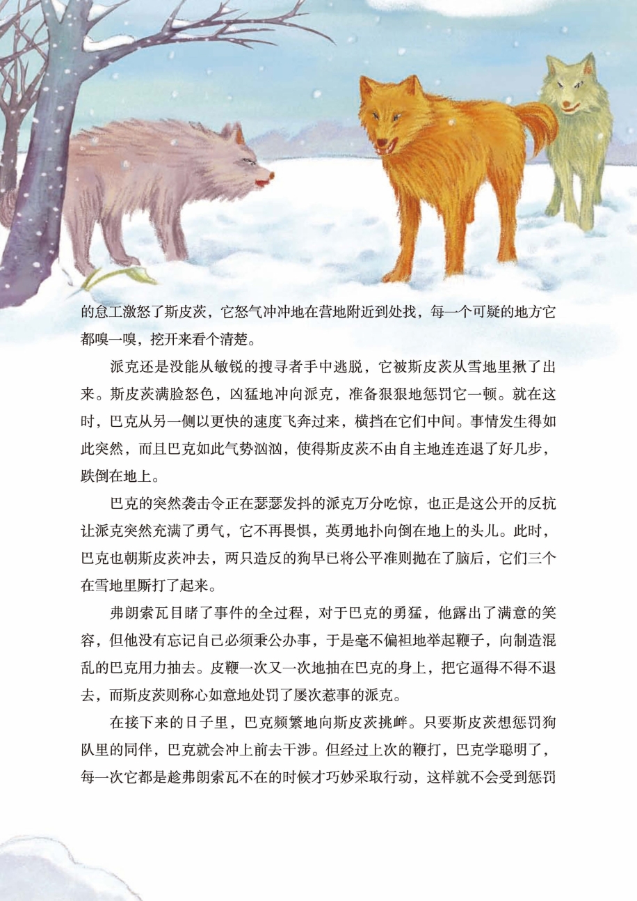 巴克的突然袭击令正在瑟瑟发抖的派克万分吃惊,也正是这公开的反抗让派克突然充满了勇气,它不再畏惧,英勇地扑向倒在地上的头儿。此时,巴克也朝斯皮茨冲去,两只造反的狗早已将公平准则抛在了脑后,它们三个在雪地里厮打了起来。