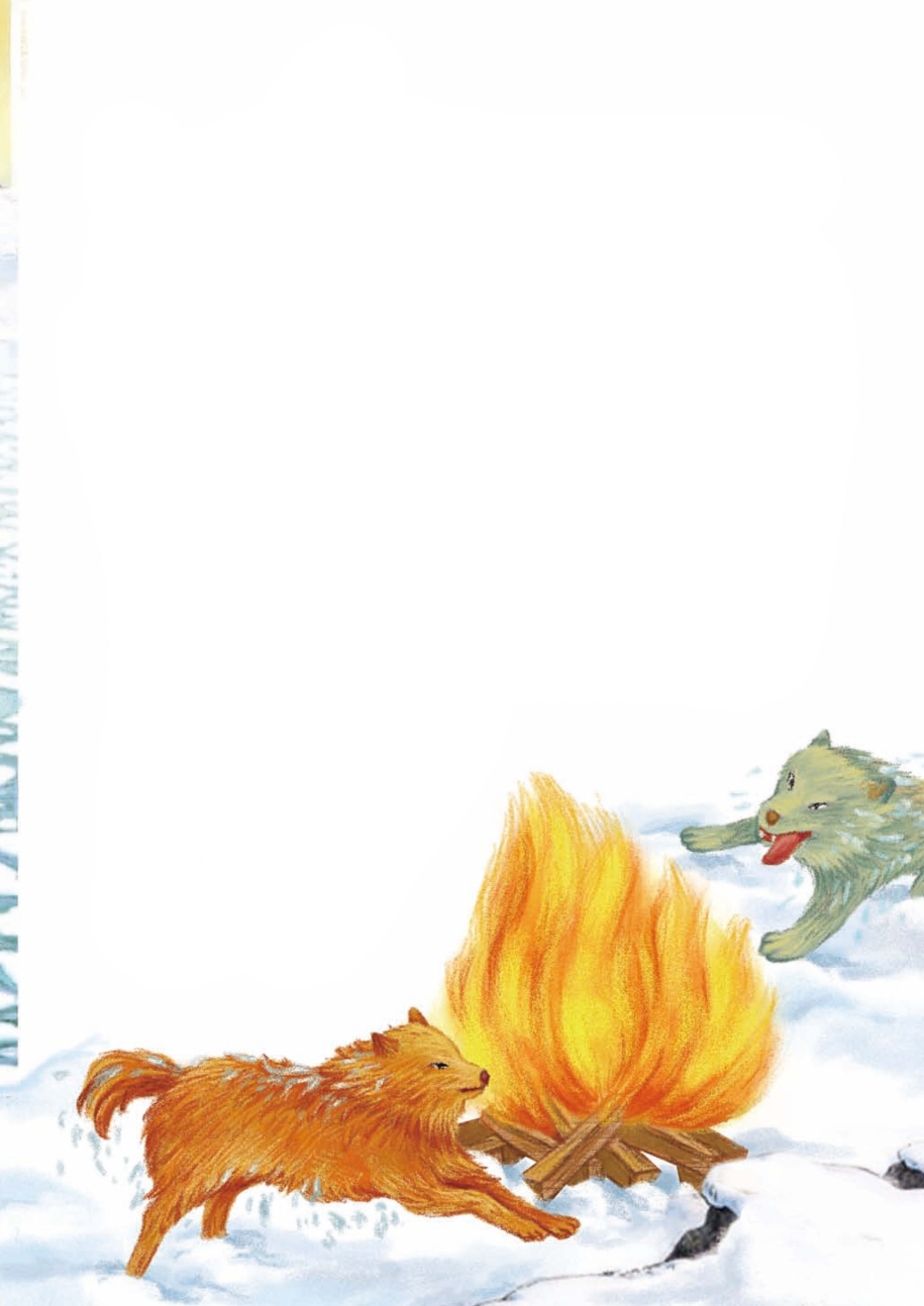 有一次,雪橇将戴夫和巴克一起拖进了冰洞里。它们越挣扎,冰就裂得越快,它们也就陷得越深。当佩罗和弗朗索瓦费尽力气把它们拉上来的时候,它们已经快冻僵了,差一点儿就冻死了。经验丰富的佩罗立即在安全的地方生了一堆火,让它俩绕着火堆奔跑。它们非常听话,不断围着火堆跑,通过运动和火让身上的冰快速融化,使自己暖和起来。因为离火堆太近了,一个不小心,它们的毛就被烧焦了好几处。
