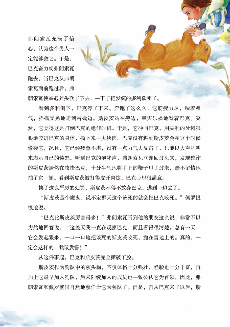 看到多利倒下,巴克停了下来。奔跑了这么久,它筋疲力尽,喘着粗气,摇摇晃晃地走到雪橇边。斯皮茨站在旁边,幸灾乐祸地看着巴克。突然,它觉得这是打倒巴克的绝佳时机。于是,它冲向巴克,用尖利的牙齿狠狠地咬进巴克的身体,撕下来一大块肉。巴克没有料到斯皮茨会在这个时候偷袭它,况且,它已经疲惫不堪,没有一点力气去反击了,只能以大声吼叫来表示自己的愤怒。听到巴克的咆哮声,弗朗索瓦立即回过头来,发现狡诈的斯皮茨居然在攻击巴克,十分生气地将手上的鞭子甩了过来,毫不留情地抽了它一顿。看到斯皮茨被打得皮开肉绽,巴克心里很满意。