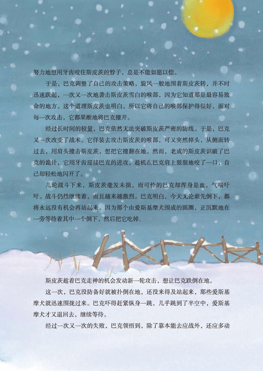 经过长时间的较量,巴克依然无法突破斯皮茨严密的防线。于是,巴克又一次改变了战术。它佯装去攻击斯皮茨的喉部,可又突然掉头,从侧面转过去,用肩头撞击斯皮茨,想把它撞翻在地。然而,老成的斯皮茨识破了巴克的诡计,它用牙齿迎接巴克的进攻,趁机在巴克肩上狠狠地咬了一口,自己却轻松地闪开了。