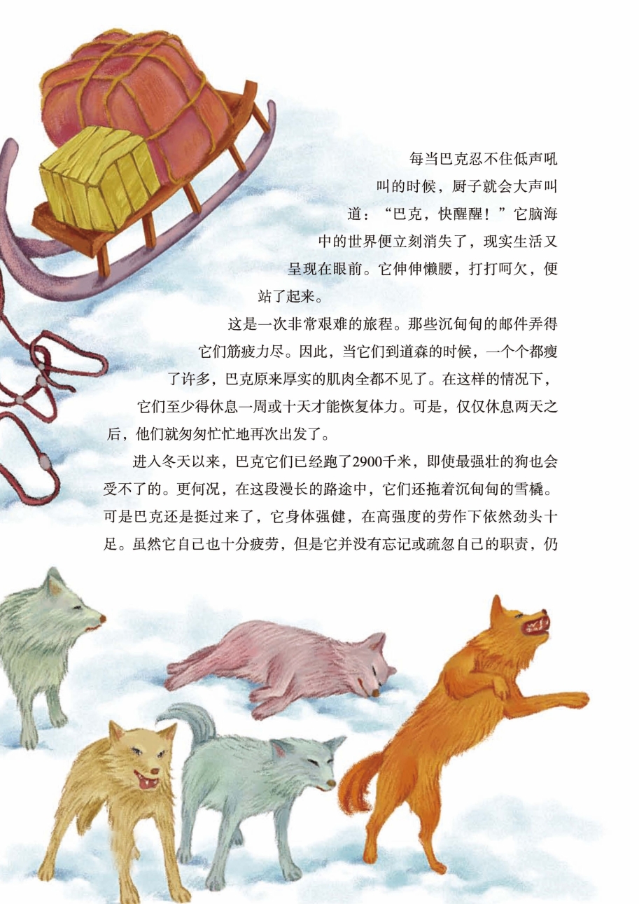 巴克的新生活开始了,但是新的生活并不美好。现在驾驶雪橇的人就是那个苏格兰混血儿。他带着巴克的狗队和另外十多支狗队,沿着巴克来时走过的路返回道森。现在它们不再轻捷地飞奔,也没有破纪录的机会了,每天只是拖着沉重的雪橇,做着超负荷的苦工。虽然都是在运送邮件,可是,佩罗他们以传送政府的公文为主,公文一刻都不能耽误,所以他们不停地赶路,工作中有破纪录的机会和乐趣。但是,它们现在只是为淘金者传送来自世界各地的信函。信件不急,但是数量很多。信件在雪橇上堆得满满的,巴克它们拖着沉重的步伐一步一步慢慢地走着。