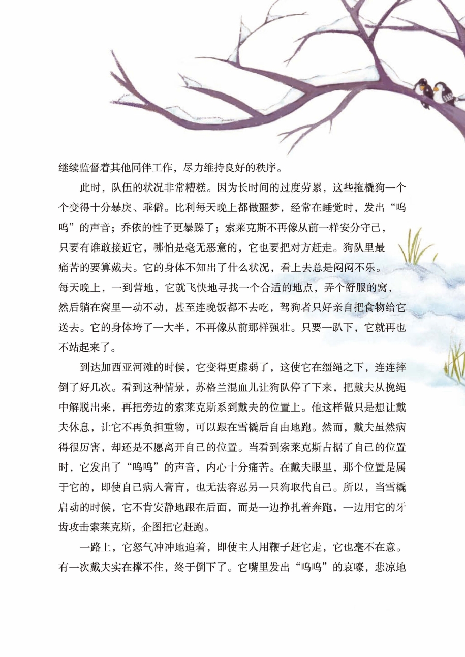 到达加西亚河滩的时候,它变得更虚弱了,这使它在缰绳之下,连连摔倒了好几次。看到这种情景,苏格兰混血儿让狗队停了下来,把戴夫从挽绳中解脱出来,再把旁边的索莱克斯系到戴夫的位置上。他这样做只是想让戴夫休息,让它不再负担重物,可以跟在雪橇后自由地跑。然而,戴夫虽然病得很厉害,却还是不愿离开自己的位置。当看到索莱克斯占据了自己的位置时,它发出了“呜呜”的声音,内心十分痛苦。在戴夫眼里,那个位置是属于它的,即使白己病入膏肓,也无法容忍另一只狗取代自己。所以,当雪橇启动的时候,它不肯安静地跟在后面,而是一边挣扎着奔跑,一边用它的牙齿攻击索莱克斯,企图把它赶跑。