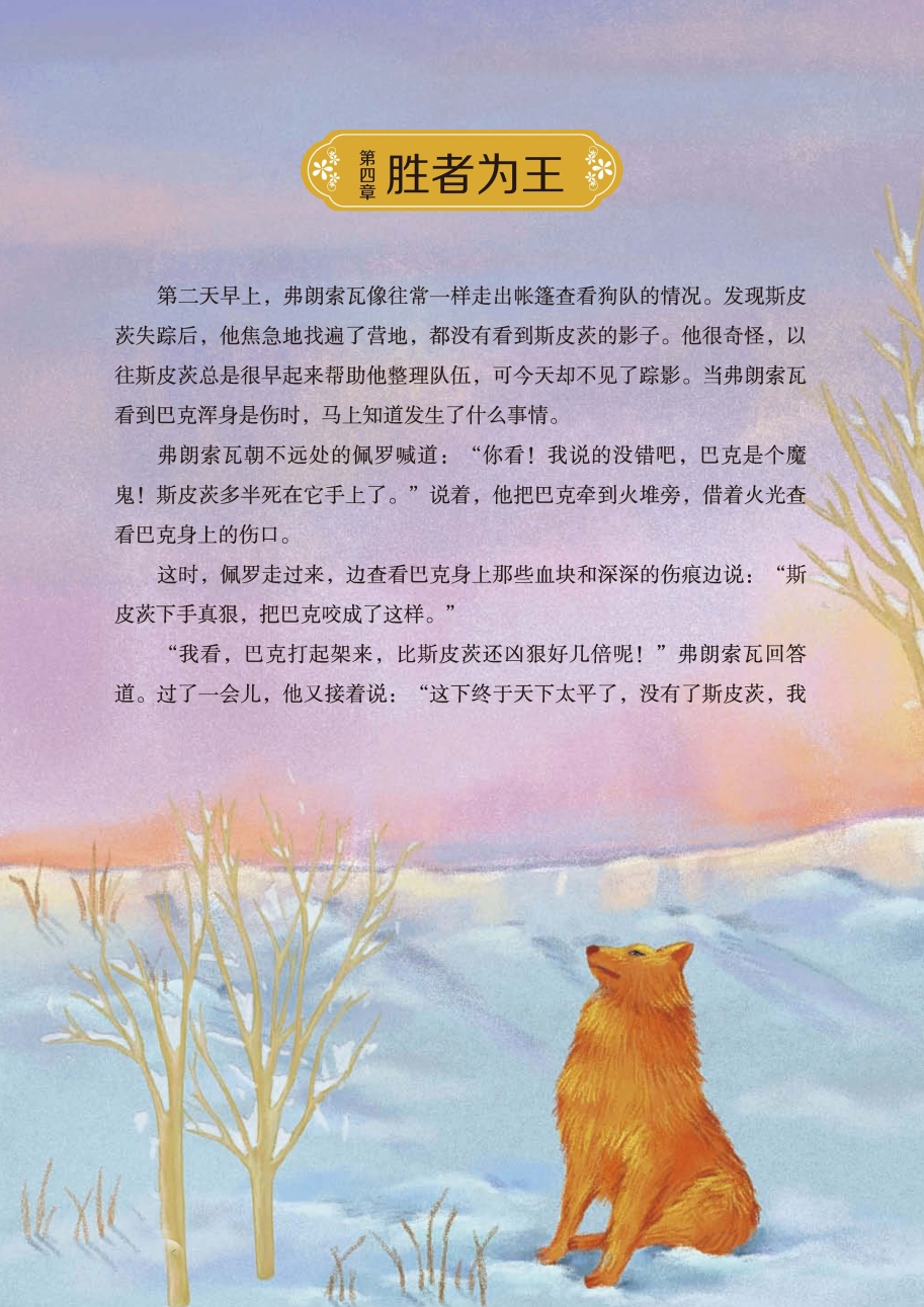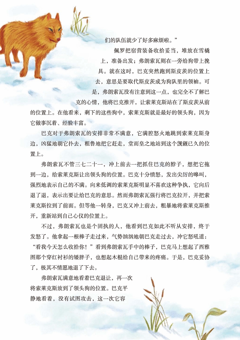 “我看,巴克打起架来,比斯皮茨还凶狠好几倍呢!”弗朗索瓦回答道。过了一会儿,他又接着说:“这下终于天下太平了,没有了斯皮茨,我们的队伍就少了好多麻烦啦。”