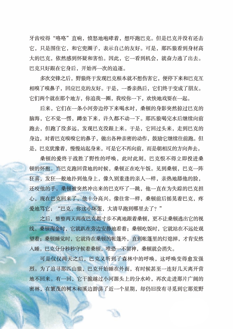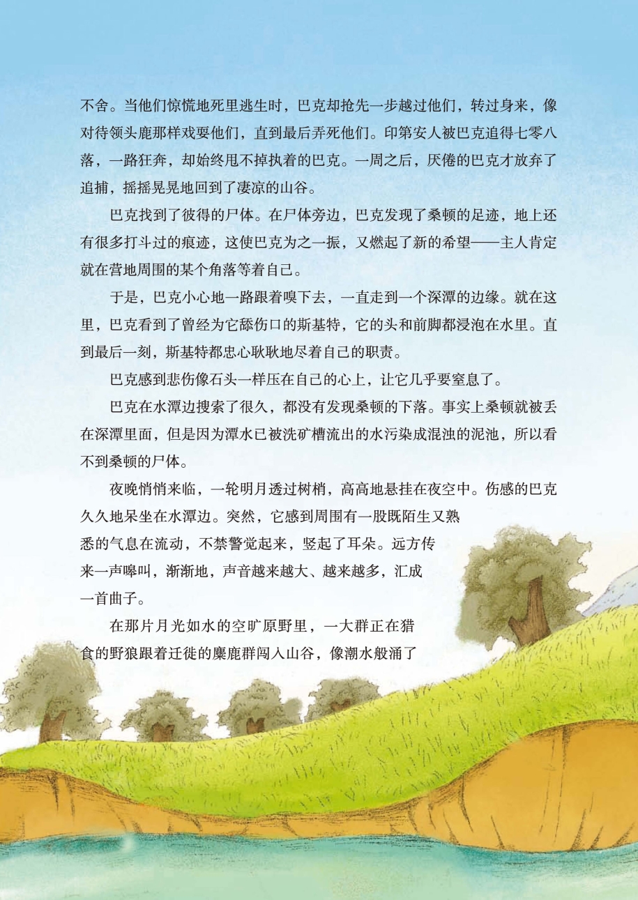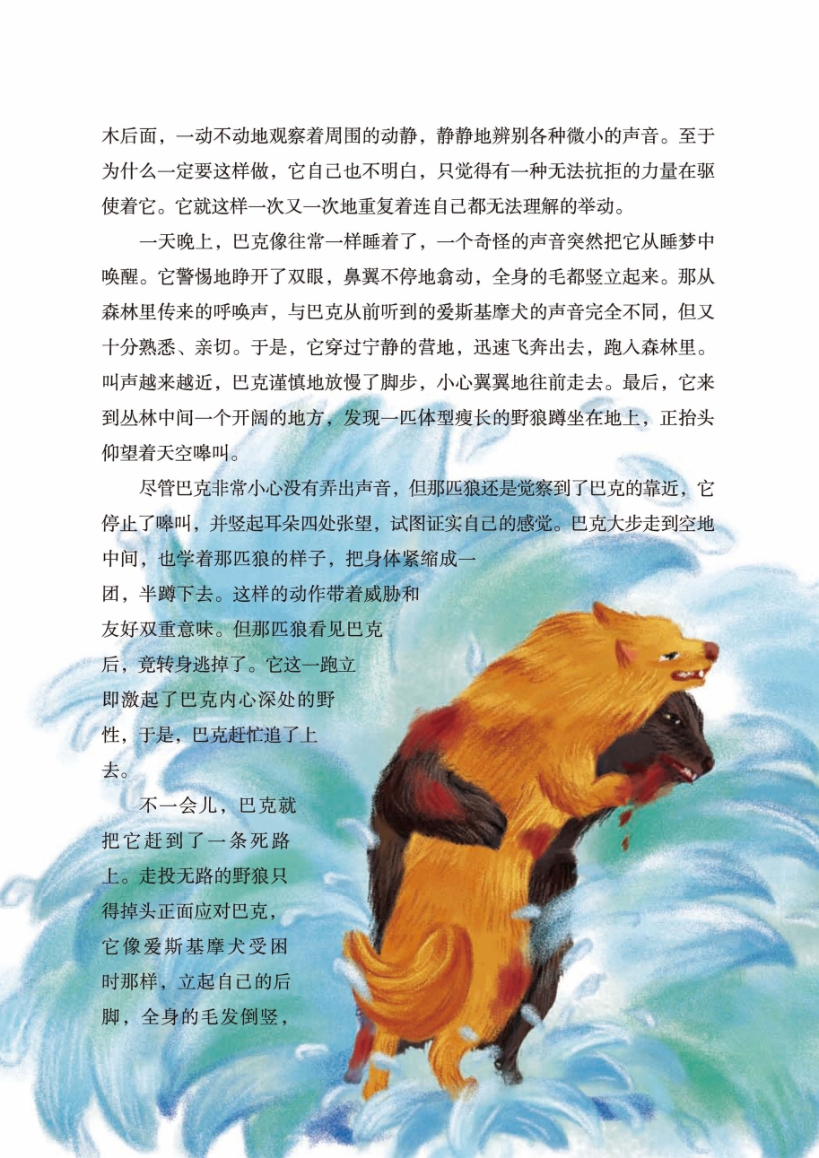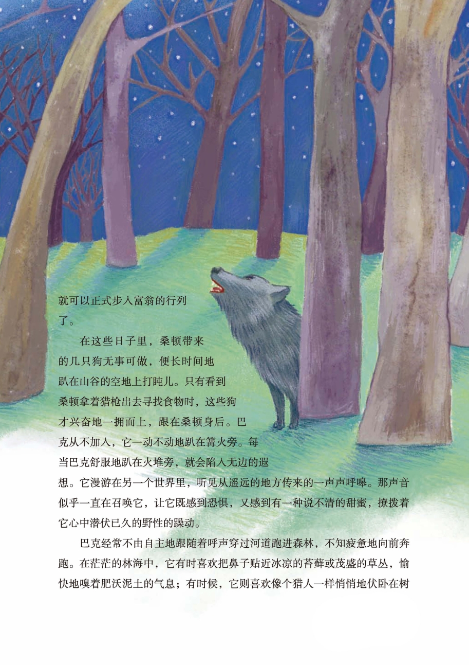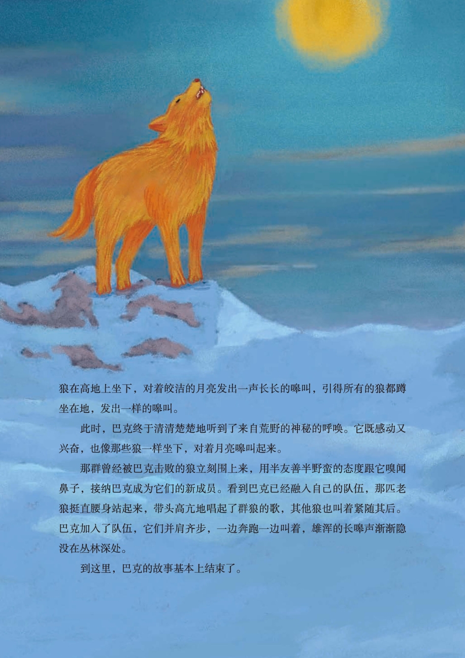 夜晚悄悄来临,一轮明月透过树梢,高高地悬挂在夜空中。伤感的巴克久久地呆坐在水潭边。突然,它感到周围有一股既陌生又熟悉的气息在流动,不禁警觉起来,竖起了耳朵。远方传来一声嗥叫,渐渐地,声音越来越大、越来越多,汇成一首曲子。