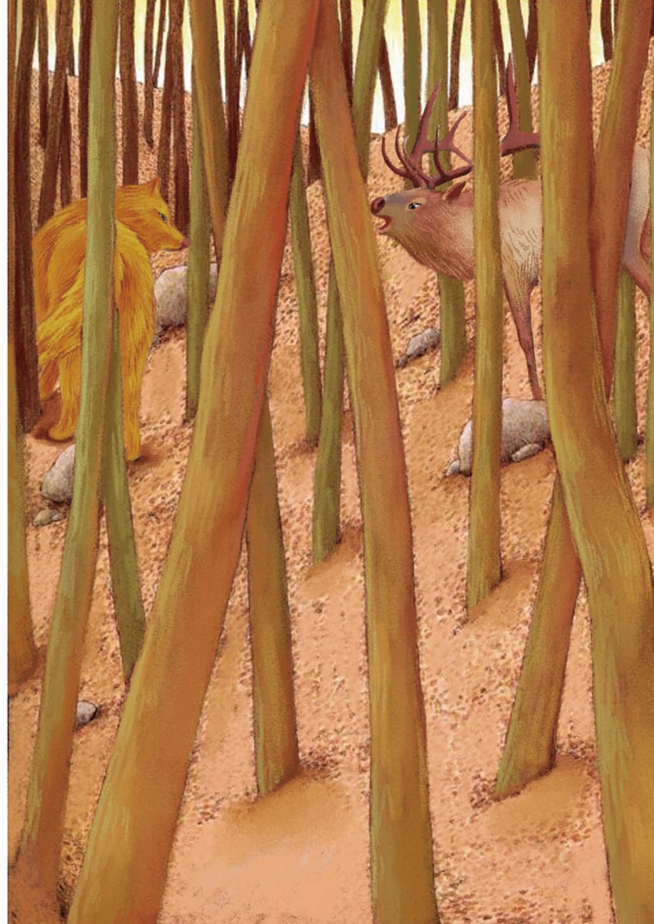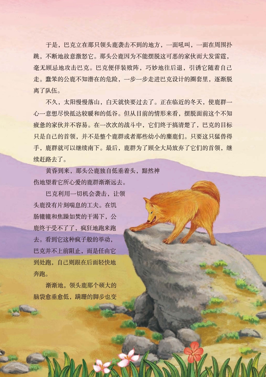 不久,太阳慢慢落山,白天就快要过去了。正在临近的冬天,使鹿群一心一意想尽快抵达较暖和的低谷。但从目前的情形来看,摆脱面前这个不知疲惫的家伙并不容易。在一次次的战斗中,它们终于搞清楚了,巴克的目标只是自己的首领,并不是整个鹿群或者那些幼小的麋鹿们。只要这只猛兽得手,鹿群就可以继续南下。最后,鹿群为了顾全大局放弃了它们的首领,继续赶路去了。