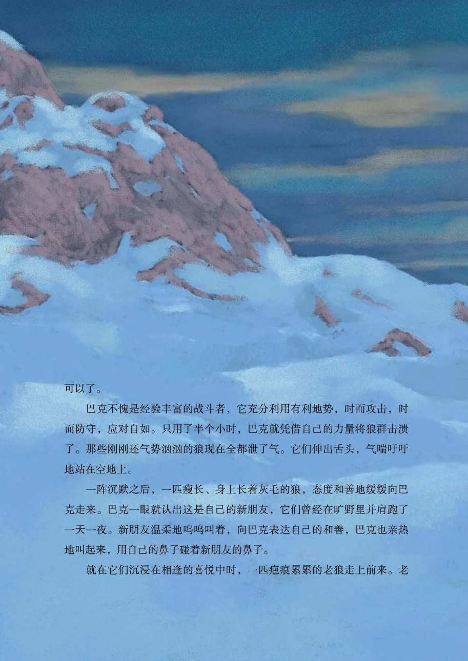 那群曾经被巴克击败的狼立刻围上来,用半友善半野蛮的态度跟它嗅闻鼻子,接纳巴克成为它们的新成员。看到巴克已经融入自己的队伍,那匹老狼挺直腰身站起来,带头高亢地唱起了群狼的歌,其他狼也叫着紧随其后。巴克加入了队伍,它们并肩齐步,一边奔跑一边叫着,雄浑的长嗥声渐渐隐没在丛林深处。