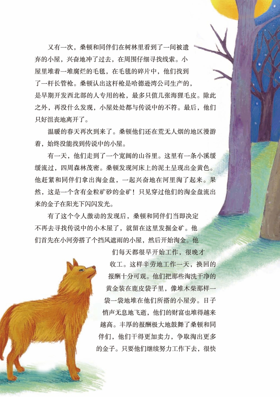 又有一次,桑顿和同伴们在树林里看到了一间被遗弃的小屋,兴奋地冲了过去,在周围仔细寻找线索。小屋里堆着一堆腐烂的毛毯,在毛毯的碎片中,他们找到了一杆长管枪。桑顿认出这杆枪是哈德逊湾公司生产的,是早期开发西北部的人专用的枪,最多只值几张海狸毛皮。除此之外,再没什么发现,小屋处处都与传说中的不符。最后,他们只好沮丧地离开了。