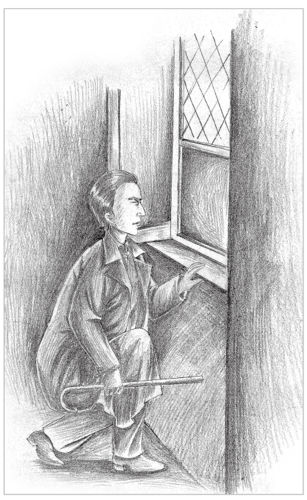 在微弱光线中,我见他往前探头,全身由于注意而紧张起来。大街上已空无一人,万籁俱寂,除了我们对面那正中现出人影的明亮的黄色窗帘之外,什么也看不见。寂静中,我耳边响起了只有在忍住极度兴奋时才会发出的那种细微的咝咝声。不一会儿,他拽住我退到最黑的屋角,一手捂着我的嘴。大街仍静静地展现在我们面前。但我发觉了他那超人的感官已经察觉了的东西。一阵蹑手蹑脚的声音传进我的耳朵,这声音是从我们藏身的这所屋子后面传来的。一扇门打开又关上了。过了一会儿,走廊里响起蠕动的脚步声。这本不想弄出声的脚步却在空屋中引起刺耳的回响。福尔摩斯靠墙蹲下,我也蹲下,手里紧握着左轮枪柄。朦胧中我看见一个人影。他站了片刻,然后弯下身子偷偷走进屋里。人影离我们不到三码。我已经准备好等他扑过来,才想起他不知道我们在这儿。他从我们旁边走过去,悄悄地靠近了窗子,轻轻地把窗户推上去半英尺。当他跪下来靠着窗口时,街上的灯光不再受积满灰尘的玻璃的遮挡,把他的脸照得清清楚楚。