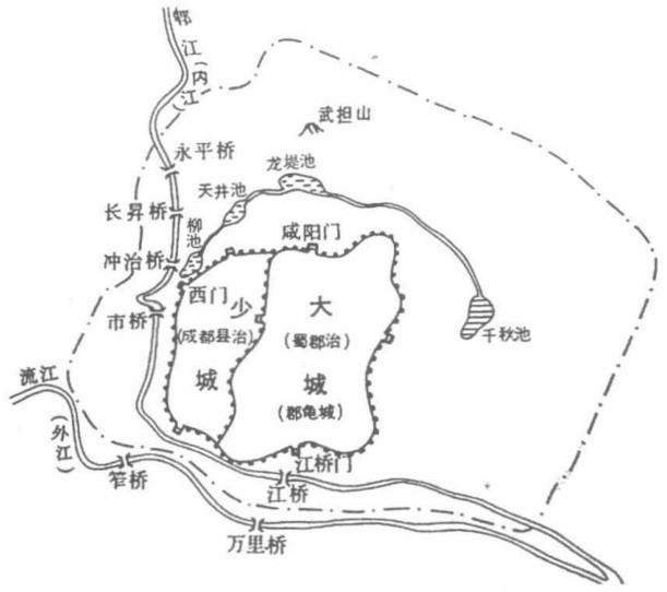 少城在大城之西,以大城的西城墙为东垣,于是东西二城倚背的形势出现。