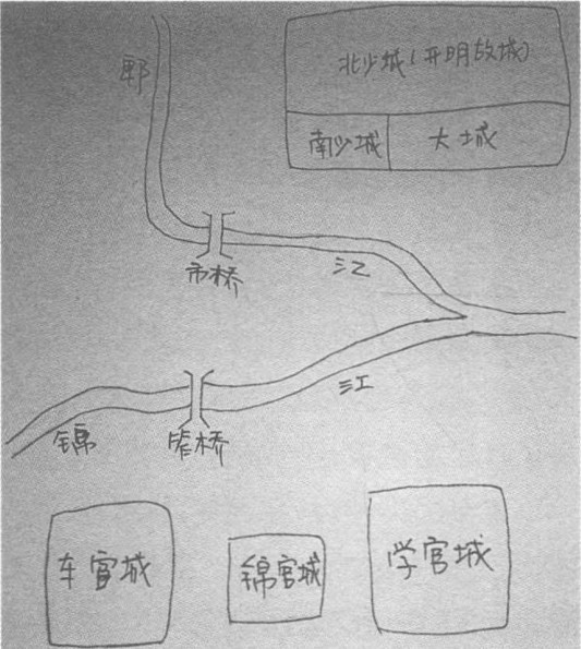 根据城市的规划和布局,锦官城的选址在“益州南,笮桥东,流水南岸,号锦里”。笮桥是南河上著名的七星桥之一,《成都城坊古迹考》据此认为,锦官城的位置在今西较场外锦江南岸百花潭到南河桥一带。为何将锦官城选址在此处?其理由是此处江水与其他地方的不太相同:我们知道蜀锦在织成之后,需在江水中漂练,漂练的目的,是达到脱胶与漂白的效果,使其更具光泽,这道工序,就是左思《蜀都赋》记载的“贝锦斐成,濯色江波”。