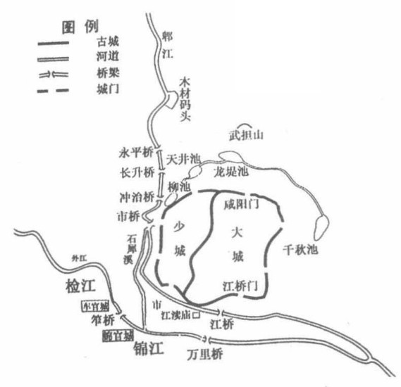 成都城除了两江之外,还有四座因修城而挖的池塘。城北为龙堤池,其具体位置在今市内青龙街一带。魏晋以来即相传,扬雄故宅就在池畔。龙堤池也被人们认为是扬雄的洗墨池,简称“墨池”。又,城东千秋池,西有柳池,西北有天井池。“津流径通,冬夏不竭。”这一时期的成都水系发达,也是可以想见的。