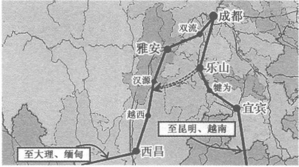 考察南方丝绸之路的路线图,可以确定为有西、南二路。其中的西行路线:成都—雅安—西昌—大姚—永昌—八莫(缅甸)—印度、中亚;而南行路线图则为:成都—宜宾—高药—昭通—昆明—弥勒—文山—河内。