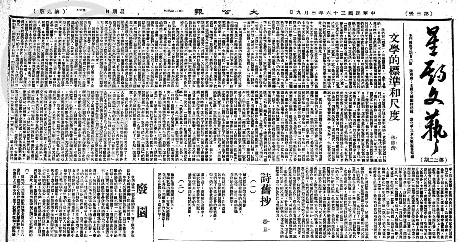 “五卅”运动接着国民革命,发展了反帝国主义运动;于是“反帝国主义”也成了文学的一种尺度。抗战起来了,“抗战”立即成了一切的标准,文学自然也在其中。胜利却带来了一个动乱时代,民主运动发展,“民主”成了广大应用的尺度,文学也在其中。这时候知识阶级渐渐走近了民众,“人道主义”那个尺度变质成为“社会主义”的尺度,“自然”又调剂着“欧化”,这样与“民主”配合起来。但是实际上做到的还只是暴露丑恶和斗争丑恶。这是向着新社会发脚的路。受教育的越来越多,这条路上的人也将越来越多,文学终于要配合上那新的“民主”的尺度向前迈进的。大概文学的标准和尺度的变换,都与生活配合着,采用外国的标准也如此。表面上好像只是求新,其实求新是为了生活的高度深度或广度。社会上存在着特权阶级的时候,他们只见到高度和深度;特权阶级垮台以后,才能见到广度。从前有所谓雅俗之分,现在也还有低级趣味,就是从高度深度来比较的。可是现在渐渐强调广度,去配合着高度深度,普及同时也提高,这才是新的“民主”的尺度。要使这新尺度成为文学的新标准,还有待于我们自觉的努力。