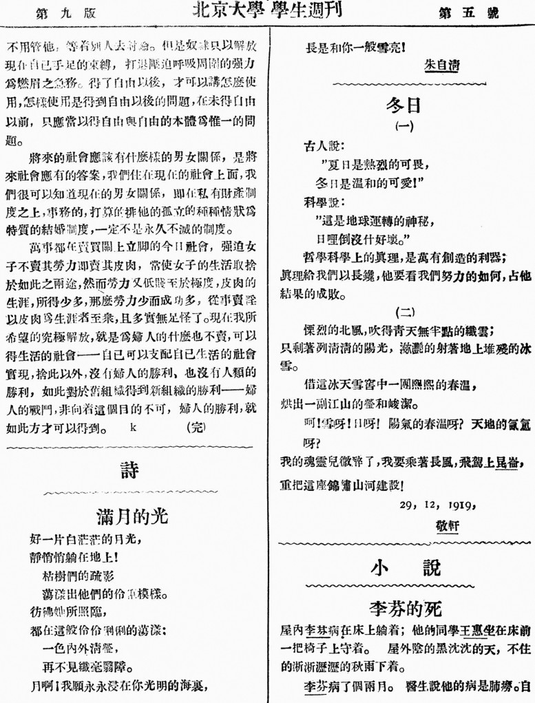 ◎朱自清发表在《北京大学学生周刊》上的新诗《满月的光》