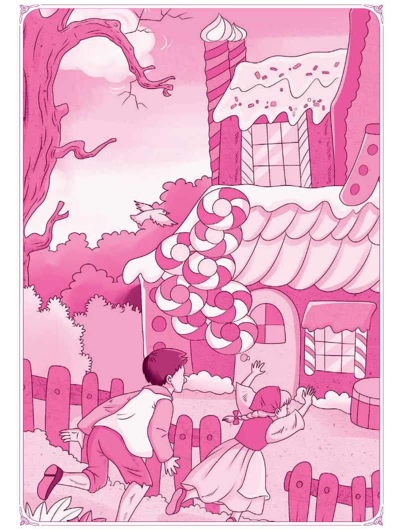 这已是他们离开父亲家的第三天早晨了,他们深陷丛林,已经迷路了。如果再不能得到帮助,他们必死无疑。就在这时,他们看到了一只通体雪白、极其美丽的鸟儿站在树枝上引吭高歌,它唱得动听极了,兄妹俩不由自主地停了下来,听它唱。它唱完了歌,就张开翅膀,飞到了他们的面前,好像示意他们跟它走。他们于是就跟着它往前走,一直走到了一幢小屋的前面,小鸟停在小屋的房顶上。他俩这时才发现小屋居然是用香喷喷的面包做的,房顶上是厚厚的蛋糕,窗户却是明亮的糖块。