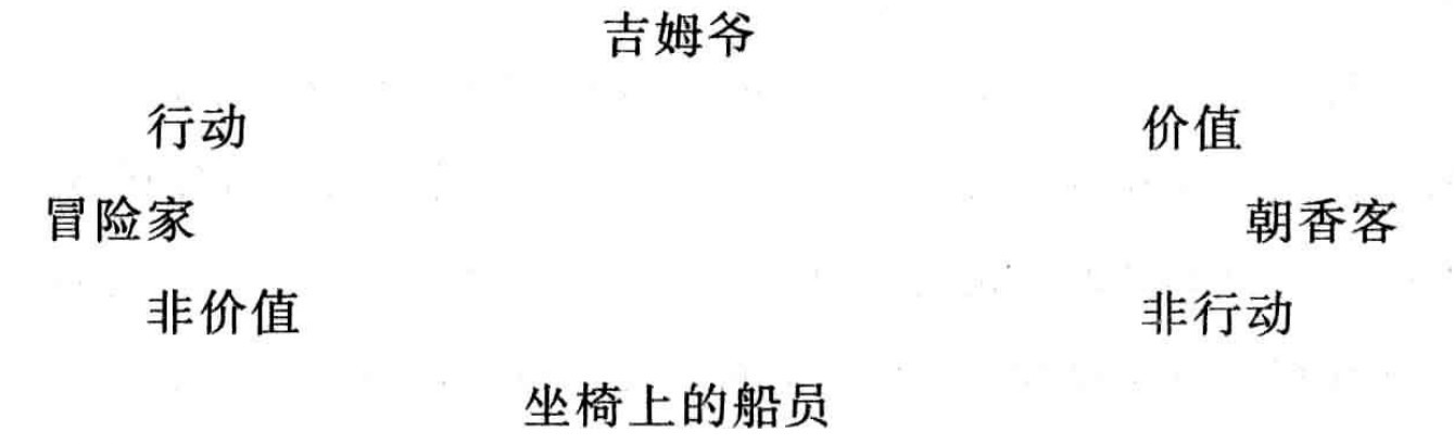 詹姆逊认为,有着执著追求和坚定信仰的朝香客,在现实中没有自己的行动,是价值与非行动的综合;而看不到意义的冒险家虽有行动却发现不了价值,是非价值与行动的结合;坐椅上的船员则是非价值与非行动的结合;而吉姆爷则代表着行动与价值的结合。因而《吉姆爷》是一个美学的宗教文本,它以叙事的形式讨论了价值的问题,其用意无非是要为行动与价值这一19世纪工具化社会出现的实际矛盾提供想象的解决。吉姆的死既宣告了这一矛盾的不可解决,又暗示关于英雄吉姆爷的叙事实际上只是一个西方关于自己的神话:英雄是不存在的,他只是意识形态上的一种完成,《吉姆爷》的意识形态封闭就在于它通过一个“不可能的英雄”构筑了一个有关英雄的神话。