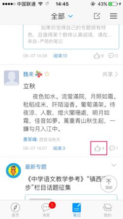 (7)点击笔记右下方的点赞按钮可直接点赞该笔记