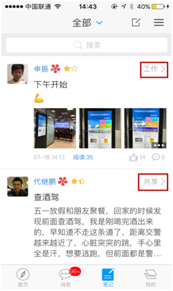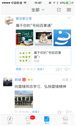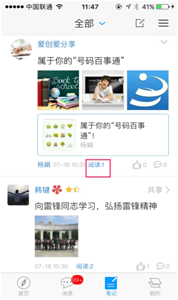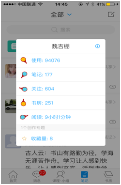 (1)点击页面底部笔记按钮,切换到笔记模块,阅读笔记。笔记显示内容包括笔记的: