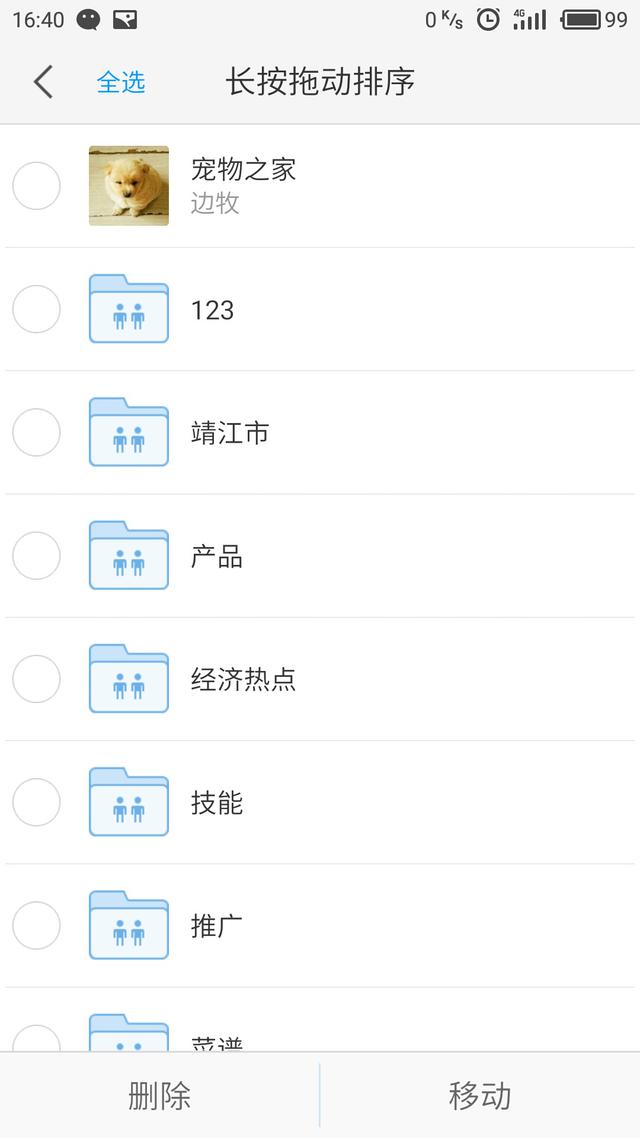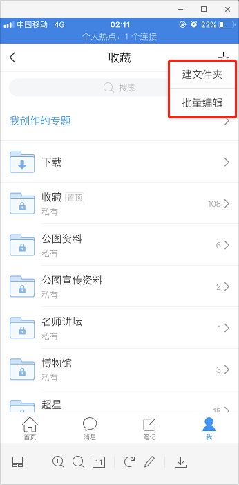 批量编辑:用于方便用户快速对多量内容进行操作。点击后,列表每一行前出现圆形勾选框,点击勾选想操作的内容后,可一键进行“删除:或”移动“到相应文件夹,长按某一条内容后,可拖动改变顺序。