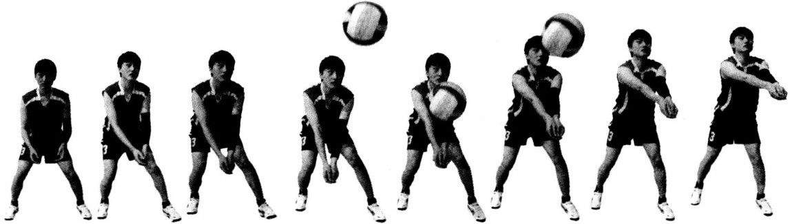 (4)垫击球动作:当球飞到腹前约一臂距离时,两臂夹紧前伸,插入球下,同时配合蹬地、跟腰、提肩、顶肘、压腕等全身协调动作迎向来球,身体重心随着击球动作向前上方移动。