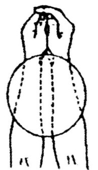 ①对掌抱球:当来球距离体前较远时,两肘伸直,手腕自然下垂,五指自然张开,两手掌相对,大拇指朝上,距离大于两小指的距离,左右手掌斜相对,形成一个与气排球大小相吻的弧形,以便抱住球的两侧。