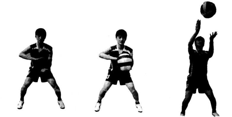②对指抱球:双手指相对,托抱于球的底部,击球瞬间以手指和手腕的抖动、弹拨及抬臂的力量将球抱出。击球点在胸腰之间。