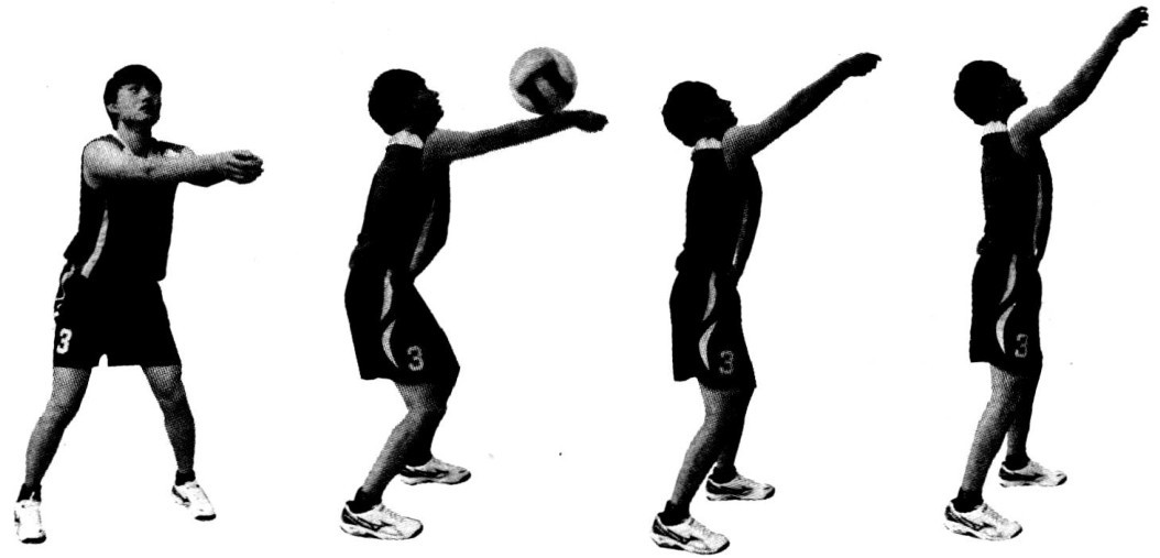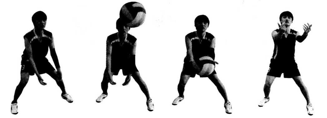 (3)击球动作:双手形成一个弧形,以全手掌触击球的下部。双手捧球击球时,上臂夹紧身体,手指、手腕与前臂在一个平面上,靠抖腕、手指弹力和前臂上托的瞬间发力动作将球击出,其动作幅度较小。