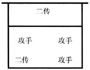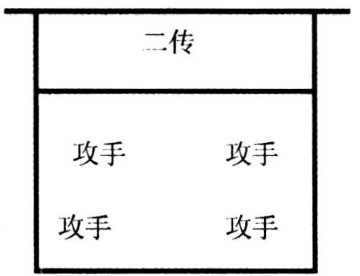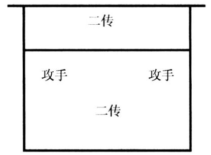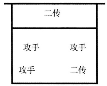 (2)“二二”配备:该阵型由两名两传队员与两名攻手组成(图3-5),各轮次二传与攻手配置均衡,在两名二传具备一定的扣球、拦网实力前提下,可以打出多点进攻战术。这种配备形式较容易掌握与应用,在高水平的气排球比赛中经常采用。