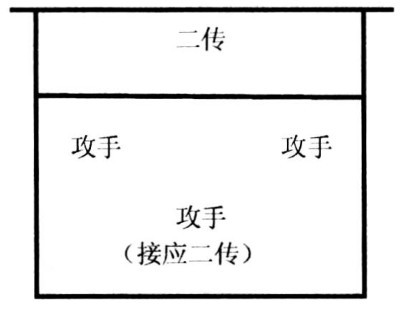 主要是后排二传队员插上。可从1号位插上到2或3号位之间的位置,准备做二传。前排2、3、4号位队员(五人制)或2、3号位队员(四人制)则后退,准备接球或进攻。