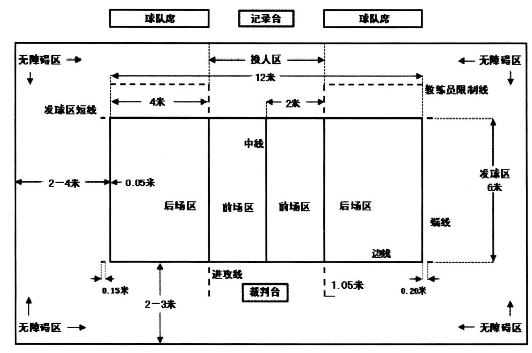 每个场区各有一条距中线2米的进攻线。进攻线(包括进攻线的宽度)前为前场区。进攻线与端线之间为后场区。进攻线外两侧各画长15厘米、间距20厘米的三段虚线为进攻线延长线。两条进攻线的延长线与记录台一侧边线外的范围为换人区。