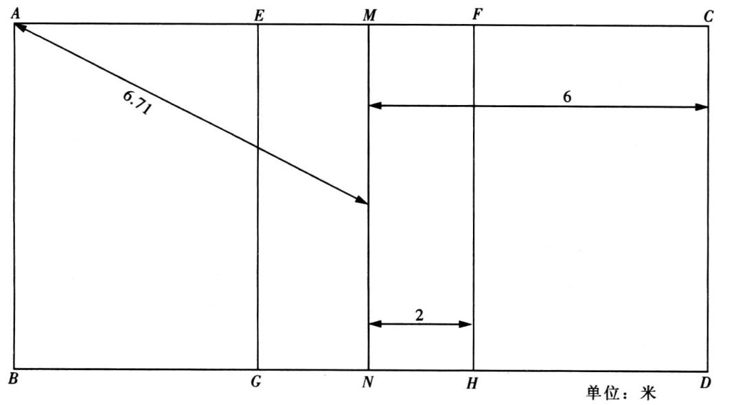 先在场地中间画一条6米长的中线MN,取中点O为圆心,以6.71米为半径,向4个场角画弧。再分别以M点、N点为圆心,以6米为半径画弧,分别同前面的4个弧线相交,共成A、B、C、D四个点。连接这四个点便形成了场区的边线和端线。再分别以M点、N点为圆心,以2米为半径,在各边线上截取E、F、G、H四个点,连接EG、FH形成进攻线。