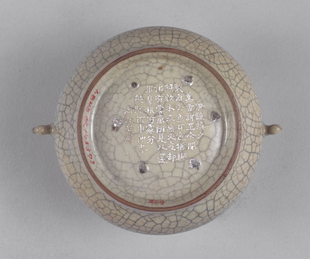 此件鱼耳炉属于清宫旧藏品,清代乾隆皇帝曾对其颇为赏识,摩挲把玩时曾拟诗一首,由宫廷玉作匠师楷书镌刻于炉之外底。诗云: