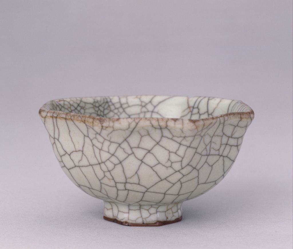 此碗造型新颖雅致,折角棱线分明,线条宛转自然,为宋哥窑器物中的珍品。