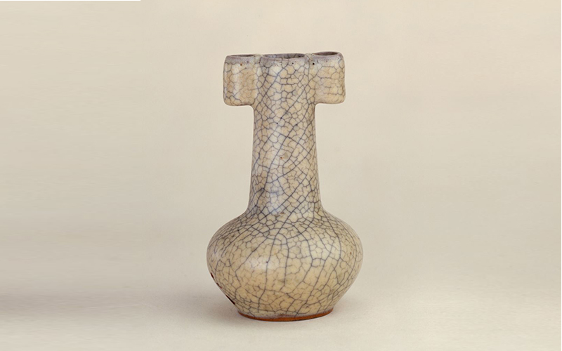 哥窑器必须具有众所周知的“金丝铁线”、“紫口铁足”。前者是哥窑的与众不同的裂纹,大纹为“铁线”,有的显蓝,大纹中套的小纹为“金丝”,有的不一定显金黄,大纹小纹合称为“面圾破”,它应当是密而不疏,曲而不直;后者是哥窑显露的较为特殊的胎色,但两者往往如鱼与熊掌一样不可兼得。瓷胎满釉器有“紫品”而无铁足。铁足应当是胎质本身的无釉颜色。铁足如是人为施加的一种黑色釉,其真伪值得怀疑,与《七修类稿续编》中记载的“其足皆铁色”相悖。