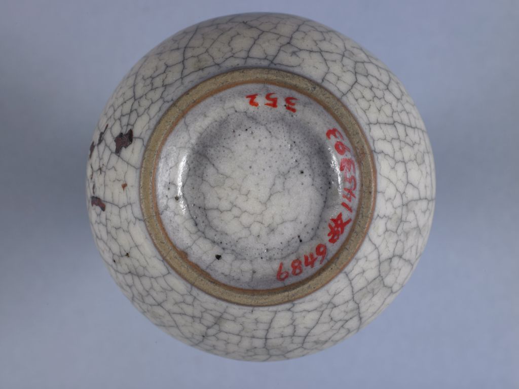球比珠大,也就是说哥窑有大小不同的两种气泡,其排列形式不是间杂错落,而是较为整齐地排列在一起。聚球式的气泡比攒珠的气泡数量要少得多,一般呈圈形排列在器物之内壁,像一个很厚的环。“攒珠聚球”它是当之无愧的划分真假哥窑的一条必不可少的重要依据。