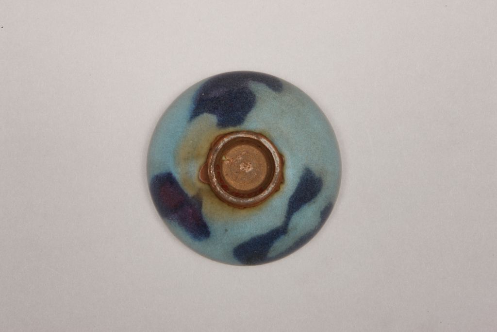 底部不再有芝麻釉,而施与器身相同的色釉,不见蚯蚓走泥纹,多有开片。烧造工艺采用大于圈足的垫饼垫烧,在板沿盘上采用三支钉支烧。由于支钉与器物粘连在一起,烧成后多是敲掉的,故支钉痕较大且高低不平。元代钧窑的产量不断增加,但质量下降。个别精品中其工艺水平却堪与宋钧媲美,只是为数不多罢了。钧瓷起于唐代,北宋达到了鼎盛,而金元时代仿钧品生产已经达到了宋钧水平。多数胎质明显粗松,胎壁较厚,外壁施釉往往不到底,胎釉交接边沿不整齐,釉面有琮眼气泡,以天蓝月白等色为多见。蓝釉红斑的斑块边界线清晰,与金代晕散的斑块有明显差别。并流行大型器。